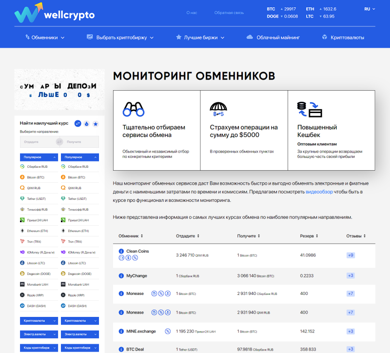 Мониторинг обменников криптовалют — удобный инструмент, который экономит массу времени при выборе оптимального обменника.