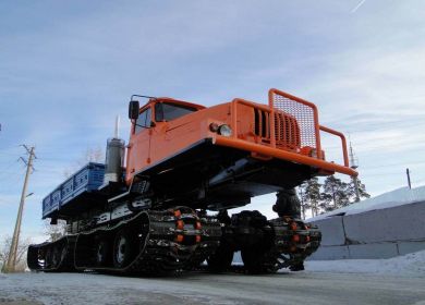 Только взгляните на эту махину! Под капотом – ЯМЗ-536, есть гидроманипуляторная установка. Инженеры приняли решение разместить баллоны с газом за кабиной и еще парочку – на лонжероне рамы. При давлении 200 атмосфер можно заправить их 250 кубометрами топлива. Внутри модуля есть сидения на 6 человек, отдельный ящик для инструментов, столик. Основное предназначение – работа в сложных условиях, перевозка вахтенных бригад.