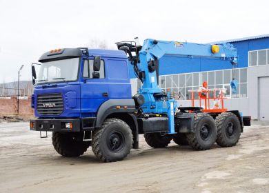 Тягач «Урал» с базой 6х6 и гидроманипулятором позволяет грузить и разгружать различные крупные предметы (плиты, железные балки), а также перевозить их. Здесь двигатель помощнее, чем в автобусе – все тот же ЯМЗ-536, но с 312 л.с. Вылет стрелы – минимум 7 м.